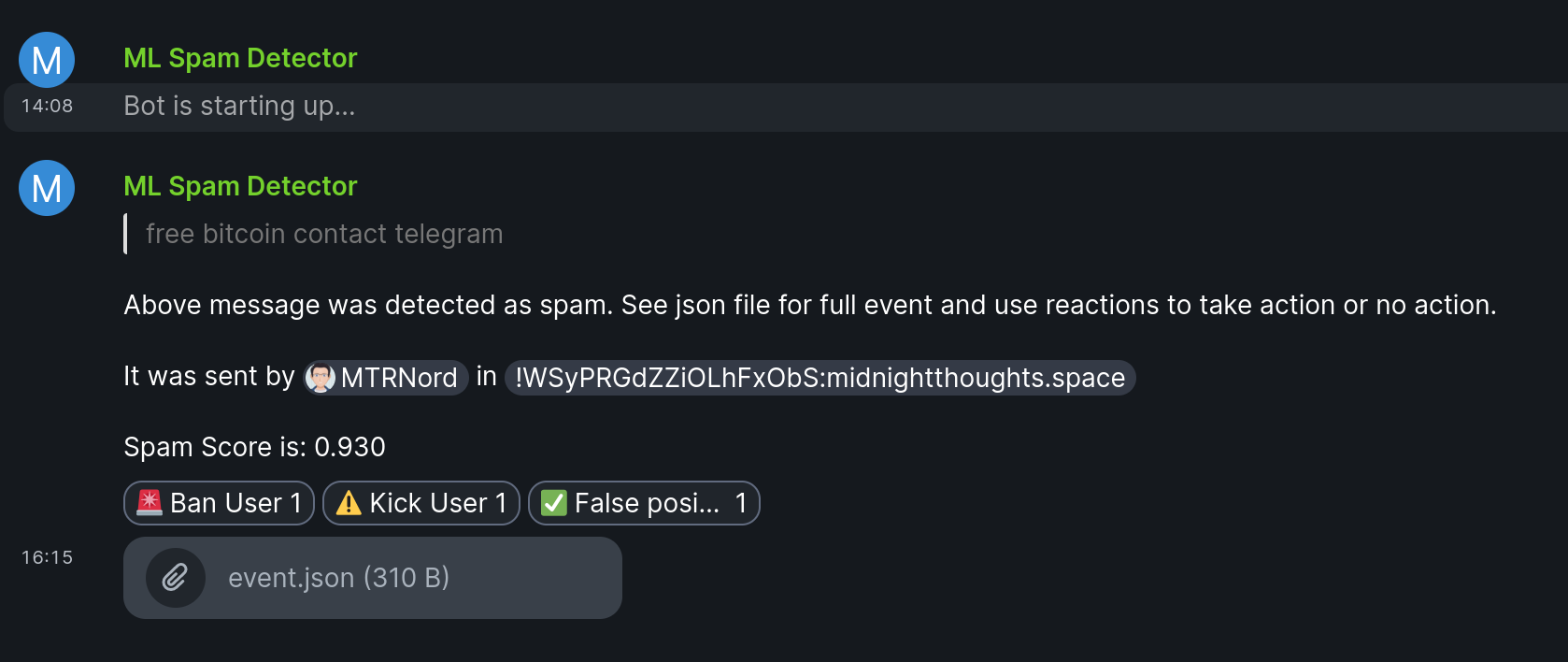 All in all, I hope to simplify the process of moderation based on what I experienced as an admin. Feel free to chime in at #matrix-spam-ml:midnightthoughts.space to suggest ideas for the bot. At the time of writing, it is still very much a prototype/demo.
