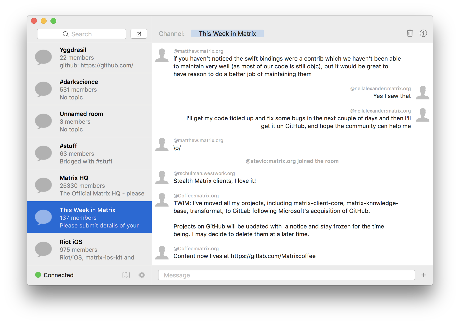 - Coffee migrated to Gitlab, including: https://gitlab.com/Matrixcoffee/matrix-client-core