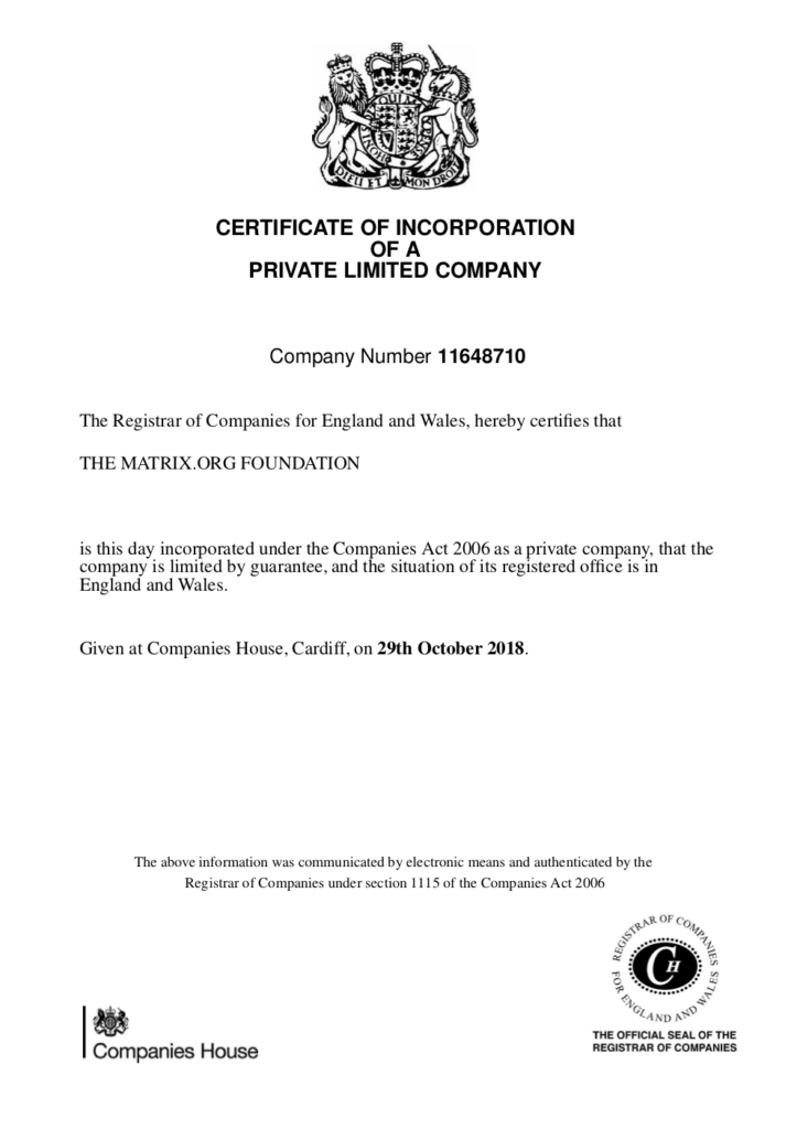 • You can read the initial Articles of Association here (although all the rest of it is fairly generic legal boilerplate for a non-profit company at this point which hasn't yet been tuned; the Matrix-specific stuff is Article 4 as quoted above).  You can also see the initial details of the Foundation straight from the horse's mouth over at https://beta.companieshouse.gov.uk/company/11648710.