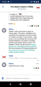 I took some time to hack on Tchap again. This time I disabled virus scanning of thumbnails and downloads in Tchap to be able to see avatars. I also wrote a non-scanning virus scanner API implementation to be able to see files, pictures and videos that are sent. The updated Tchap can be found at https://github.com/14mRh4X0r/tchap-android, the virus scanner API implementation at https://git.snt.utwente.nl/14mRh4X0r/tchap-media-scanner.