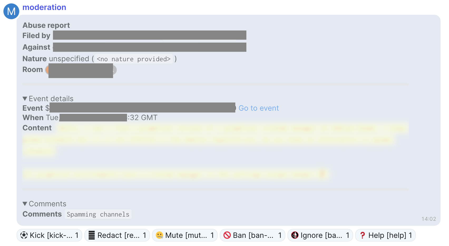 There are two ways to redact a message. You can click the button underneath a report, if you are using those reports. You can also redact a particular message by sending a message in Mjolnir's control room. This method is useful when you haven't received a report about a message, but you want to redact it.